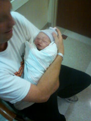 We are delighted to announce the birth of Emerson Irene Beck, born this afternoon 31 August 2010, at 3:28 P.M. in Houston, TX. to David and Karrera Irene (“Kari”) Starr Beck! Emerson Irene is a healthy 7 lbs., 5 ozs.. UPDATE! 9/6/10 We now have photos of Baby “Emmy” taken the day of her birth 8/31/10! Left, father David holds his newborn daughter. Center, mother Kari holds little Emerson (and what looks to be a lifelong best friend!). Finally, at right (photo taken 9/6/10), Grandmother Sha says, “After a nice warm bath today, Emmy is quite happy!” Click a photo for enlargements.