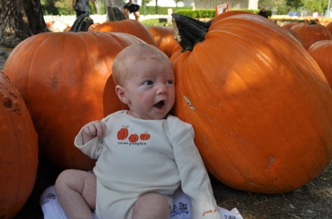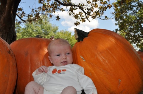 Emerson Irene Beck recently made her first trip to the pumpkin patch. At about 7 weeks old, little Emmy was just old enough to sit and lean against the pumpkins in the St. Luke’s Pumpkin Patch in her hometown of Houston, TX. (She was born 31 August 2010.) In the photo at right, Emmy seems quite shocked to have a close encounter with “The Great Pumpkin.” Move over Charlie Brown! ;-)