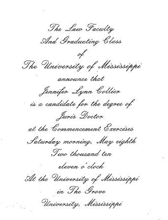 The degree of Juris Doctor will be bestowed upon Jennifer Lynn Collier on 8 May 2010 from the Law School of the University of Mississippi. She is the daughter of Teresa Fay ("Terri") Murphy O'Neal and granddaughter of John Gribbin and May Nora Johnson Murphy (Uncle John and Aunt Katie).