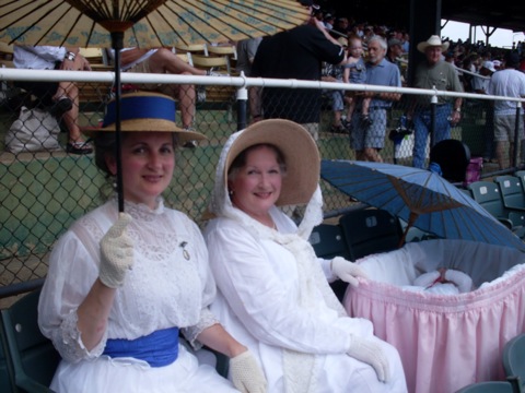 Kellet Catherine Carmichael and her mother Melanie Fay Johnson enjoy the Rickwood Classic at Rickwood Field in Birmingham, AL on 2 June 2010. Kellet's daughter Lillian Carmichael May relaxes in her basket. The ladies protect their delicate complexion with the shade of parasols. Kellet, Melanie Fay and baby Lillie were all dressed in period dress of 1910 in celebration of Rickwood Field's 100th anniversary. It is the oldest ballpark in America. Kellet's dress is an antique that once belonged to her grandmother, Lurene Hall "Dolly" Johnson. Melanie Fay's son Wylie Scott Atkinson, not pictured, also enjoyed the game dressed in period dress.